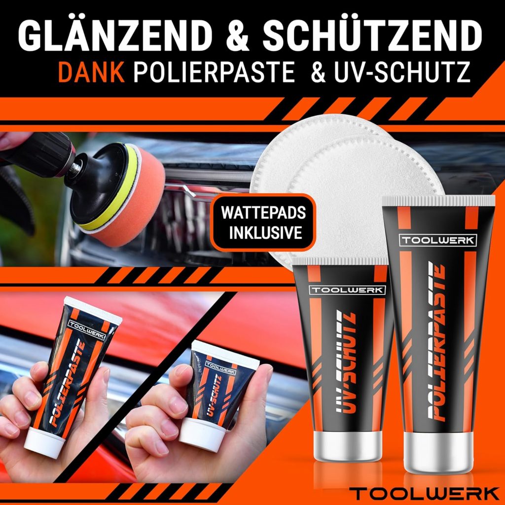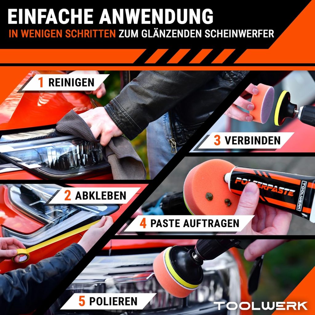 Mit TOOLWERK erhalten Sie ein bewährtes Set, das Ihre Fahrzeuglichter wie neu erstrahlen lässt. Vertrauen Sie unserem Amazon-Bestseller und erleben Sie sichere Fahrten bei jedem Wetter.