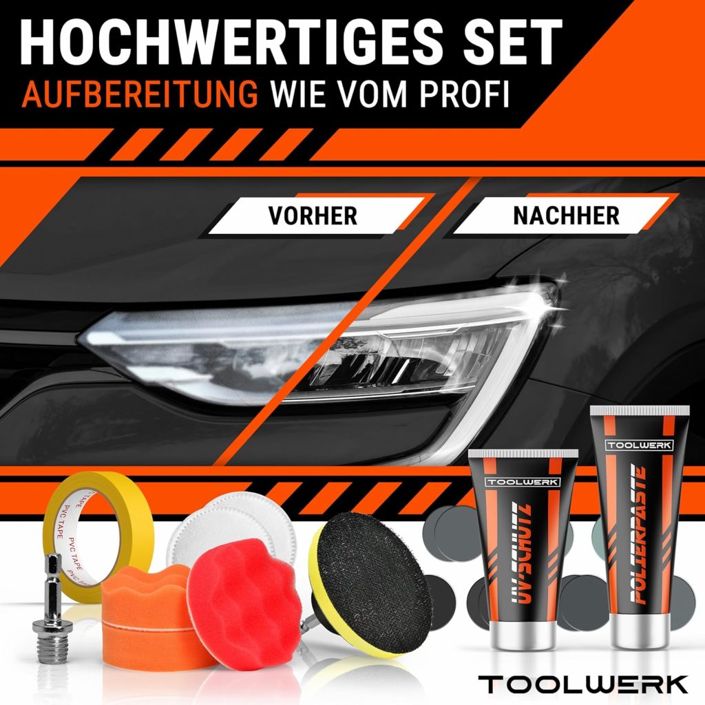 Erleben Sie, wie TOOLWERK Ihr Auto mit unserem Scheinwerferaufbereitungsset sichtbar aufwertet.